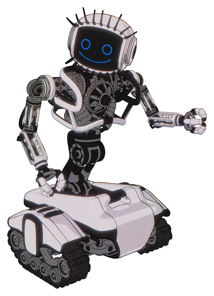 Automaton containing digital display head and happy face and eye lashes deco and heavy upper chest and no chest plating and tank tracks. White halftone toon. Fight or defense pose..
