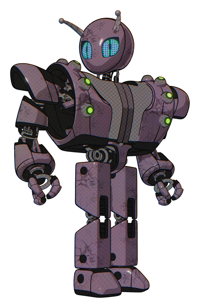Bot containing grey alien style head and blue grate eyes and bug antennas and heavy upper chest and heavy mech chest and green cable sockets array and prototype exoplate legs. Lilac metal. Hero pose.