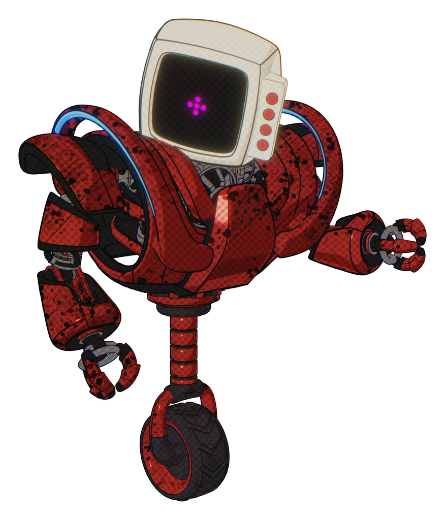 Automaton containing old computer monitor and magenta symbol display and red buttons and heavy upper chest and heavy mech chest and battle mech chest and unicycle wheel. Grunge dots cherry tomato red.