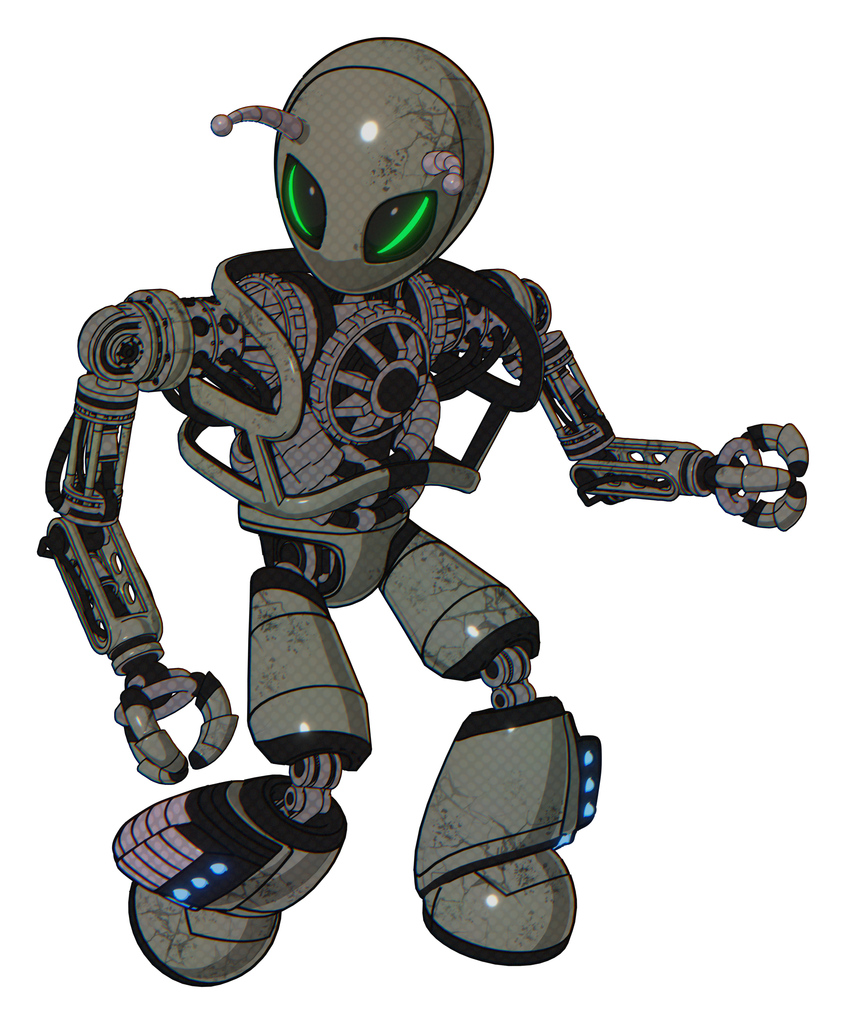 Bot containing elements: grey alien style head, green demon eyes, bug antennas, heavy upper chest, no chest plating, light leg exoshielding, megneto-hovers foot mod. Material: Concrete grey metal.