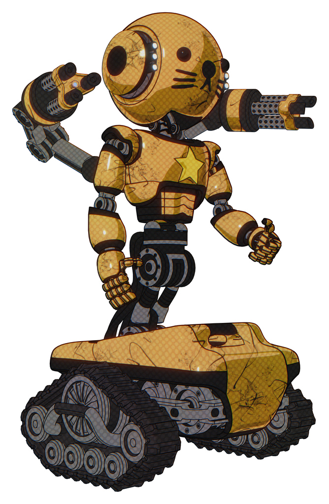 Automaton containing round head and head light gadgets and light chest exoshielding and yellow star and minigun back assembly and tank tracks and cat face. Construction yellow halftone.
