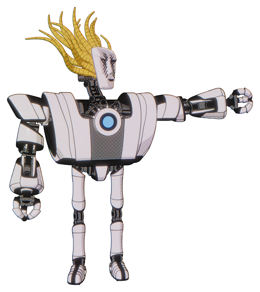 Android containing humanoid face mask and war paint and heavy upper chest and heavy mech chest and blue energy fission element chest and ultralight foot exosuit. White halftone toon.