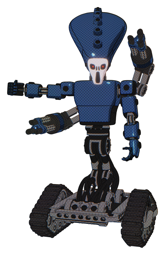 Cyborg containing flat elongated skull head and light chest exoshielding and prototype exoplate chest and minigun back assembly and tank tracks. Dark blue halftone. Arm out holding invisible object..