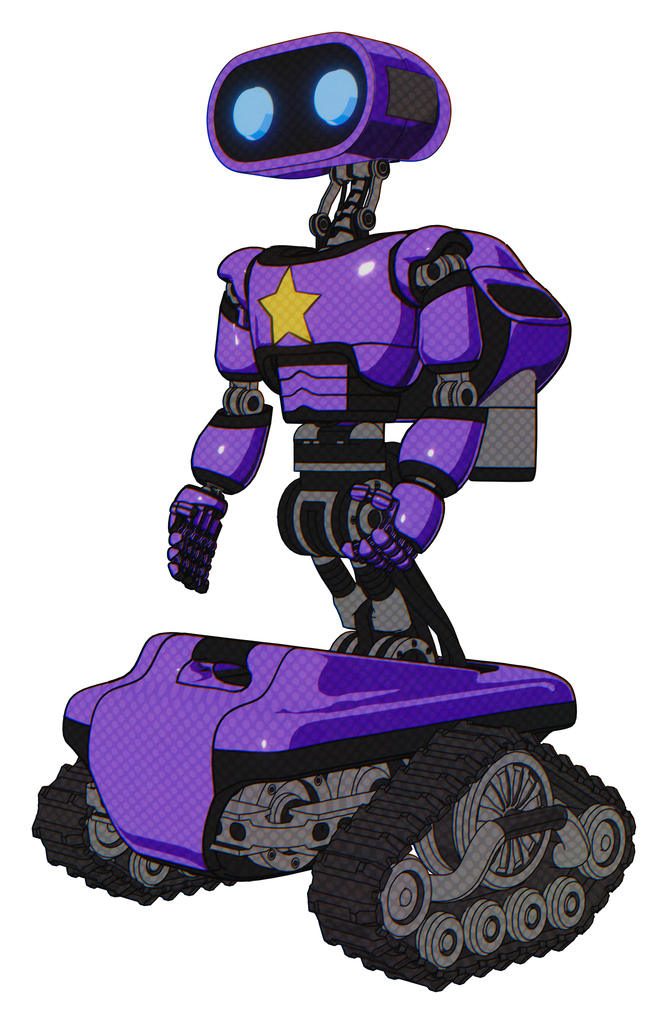 Droid containing dual retro camera head and cute retro robo head and light chest exoshielding and yellow star and rocket pack and tank tracks. Secondary purple halftone. Facing right view.