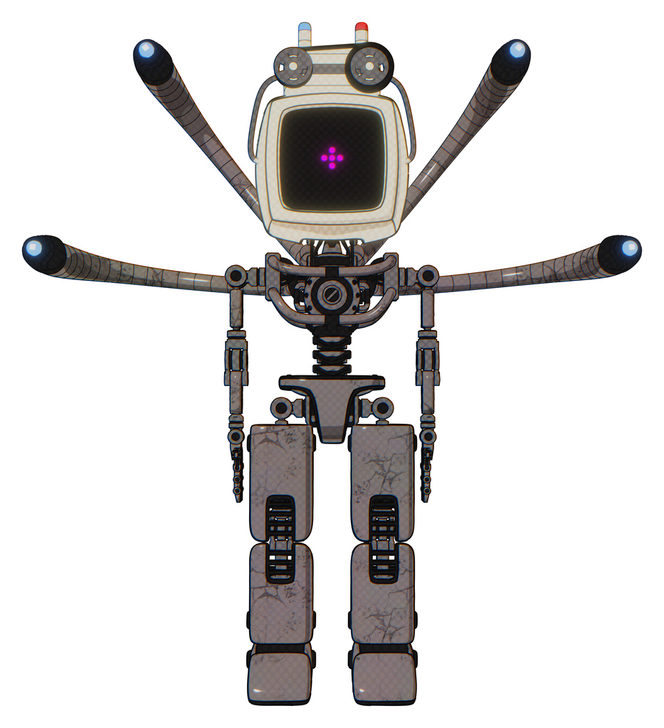 Automaton containing old computer monitor and magenta symbol display and old computer magnetic tape and light chest exoshielding and blue-eye cam cable tentacles and no chest plating .