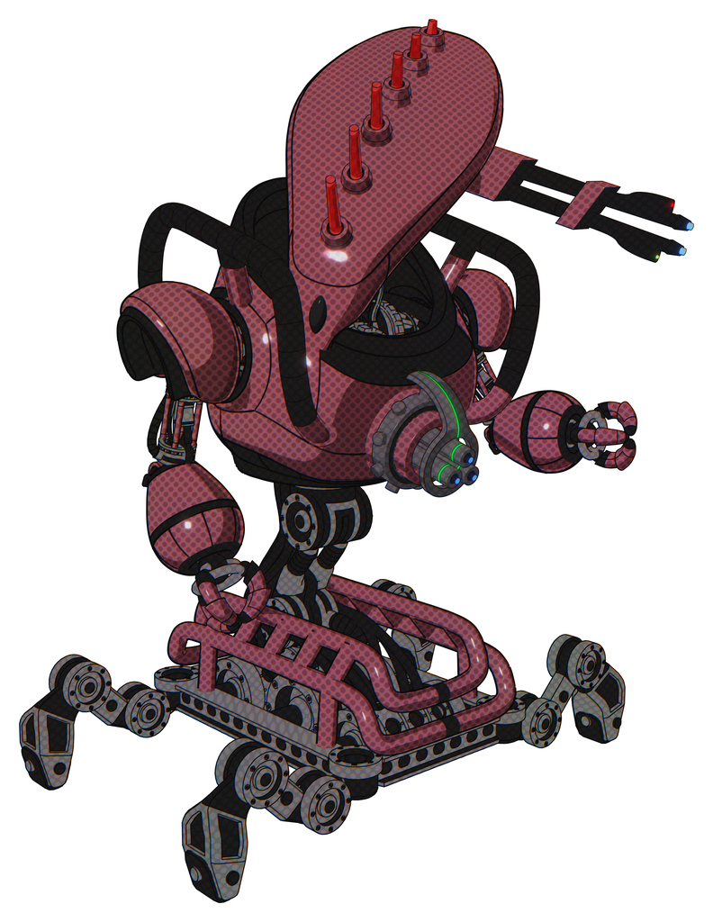 Cyborg containing flat elongated skull head and heavy upper chest and chest energy gun and insect walker legs. Muavewood halftone. Fight or defense pose..