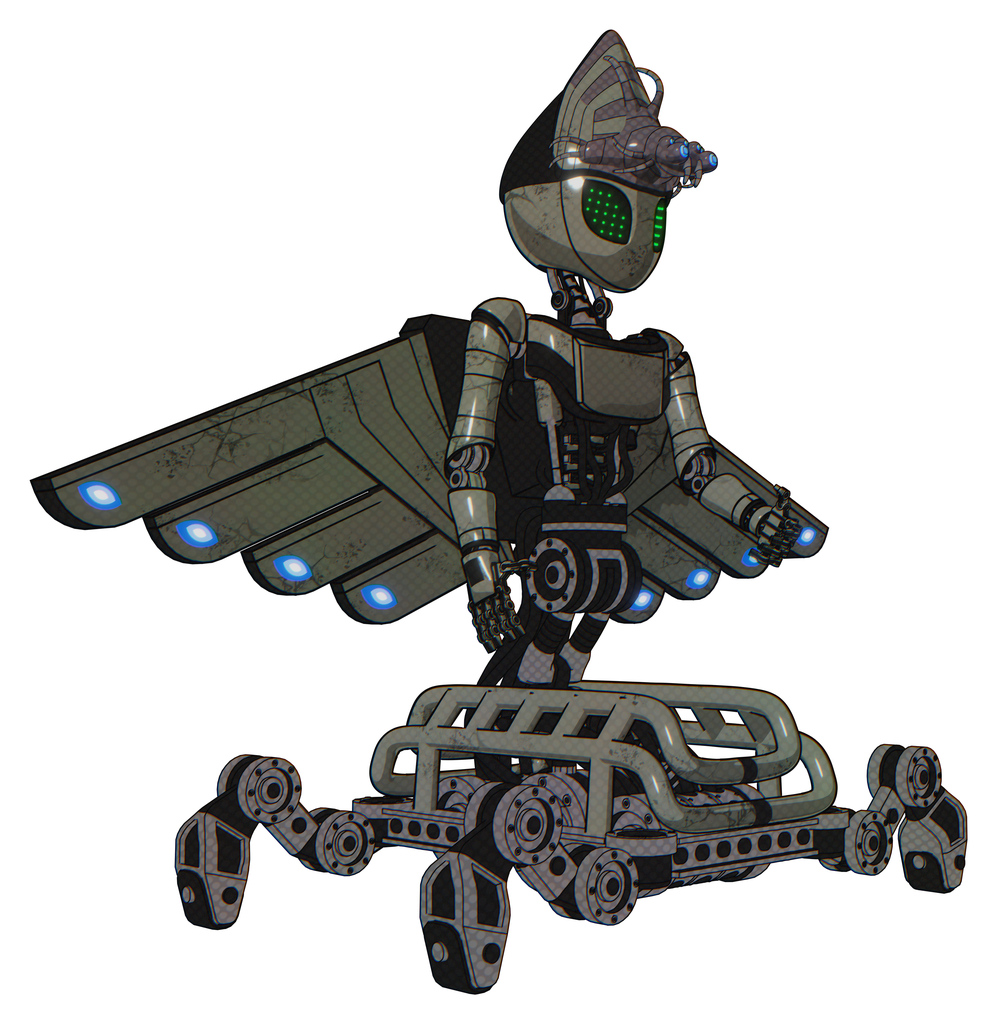 Droid containing grey alien style head and led array eyes and alien bug creature hat and light chest exoshielding and ultralight chest exosuit and cherub wings design and insect walker legs.