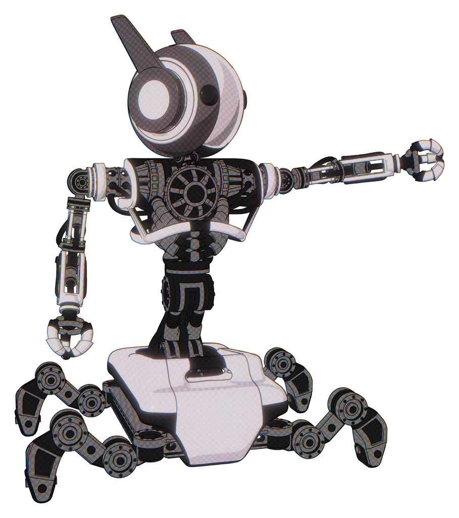 Mech containing round head and maru eyes and head winglets and heavy upper chest and no chest plating and insect walker legs. White halftone toon. Pointing left or pushing a button..