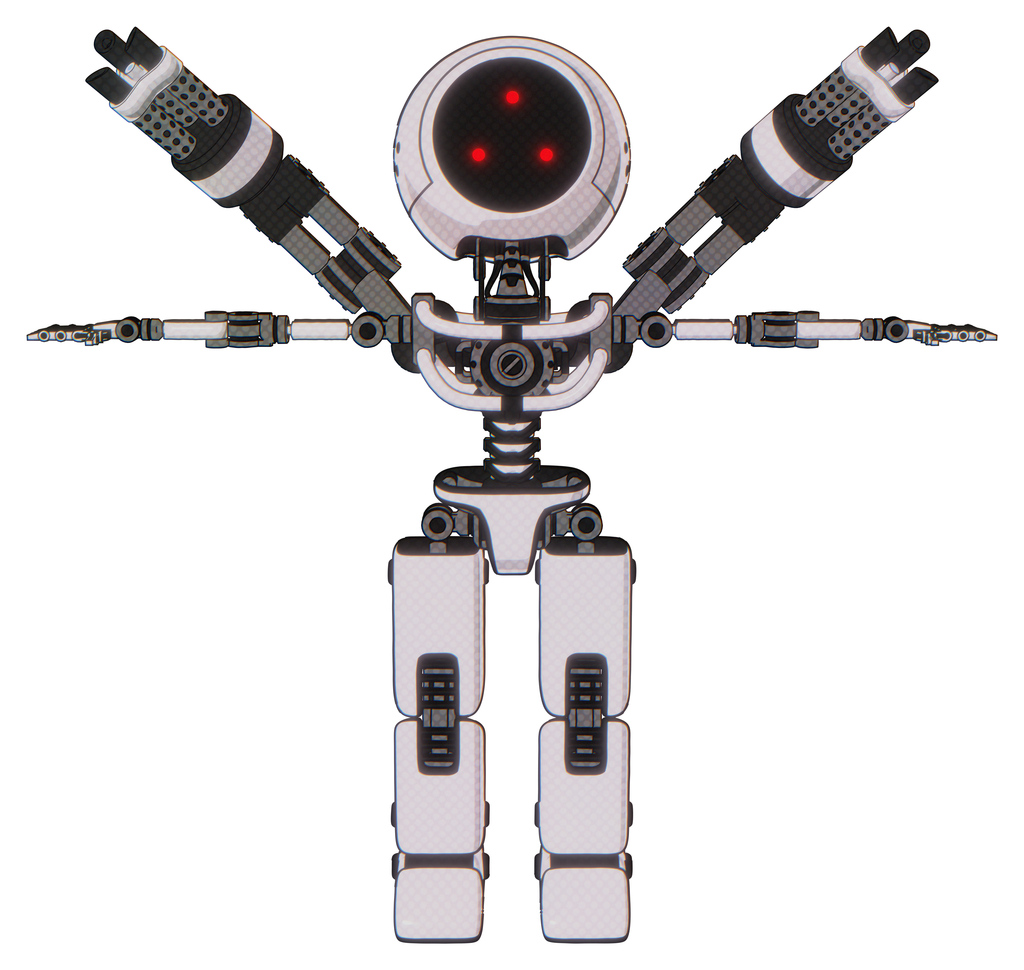 Droid containing three led eyes round head and light chest exoshielding and minigun back assembly and no chest plating and prototype exoplate legs. White halftone toon. T-pose.