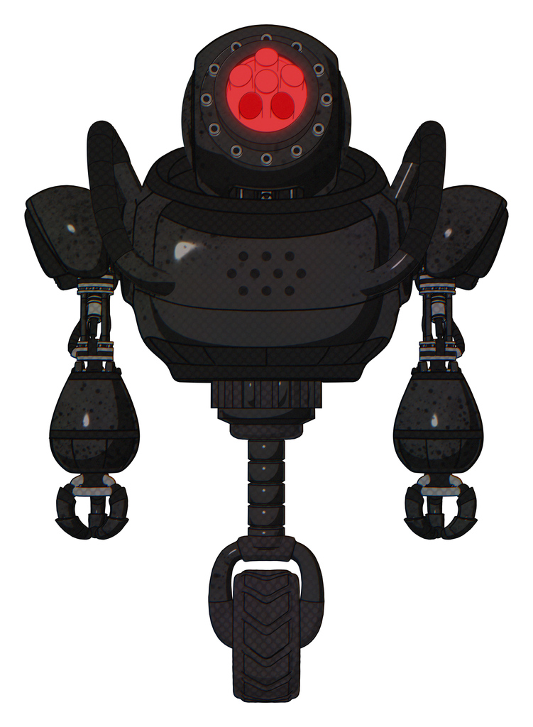Droid containing round head and red laser crystal array and heavy upper chest and unicycle wheel. Dirty black. Front view.