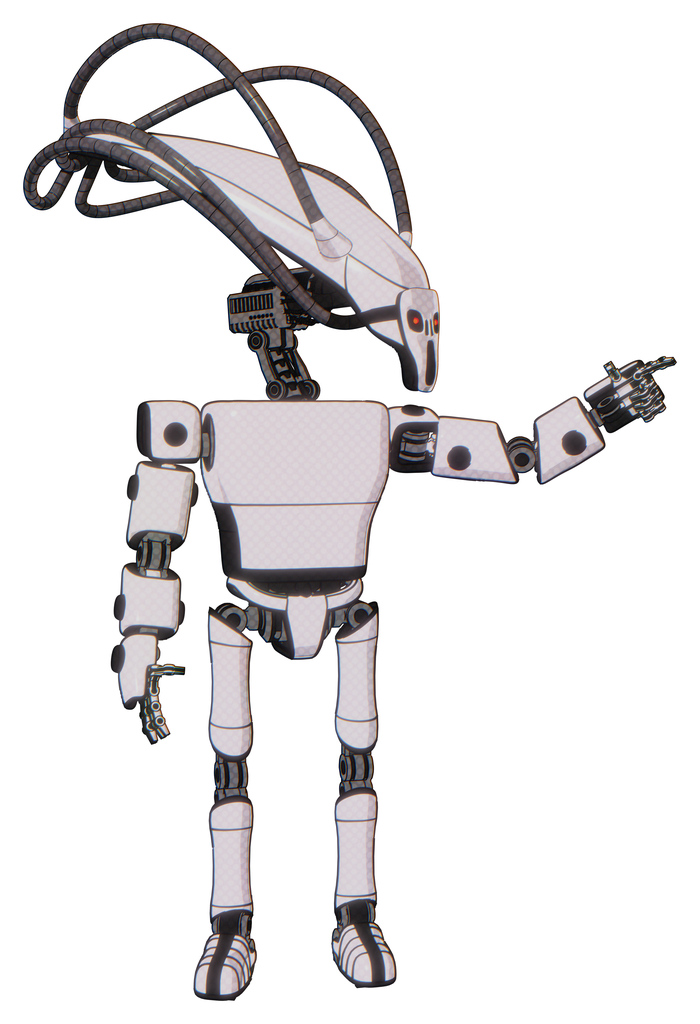 Droid containing flat elongated skull head and cables and light chest exoshielding and prototype exoplate chest and ultralight foot exosuit. White halftone toon. Pointing left or pushing a button..