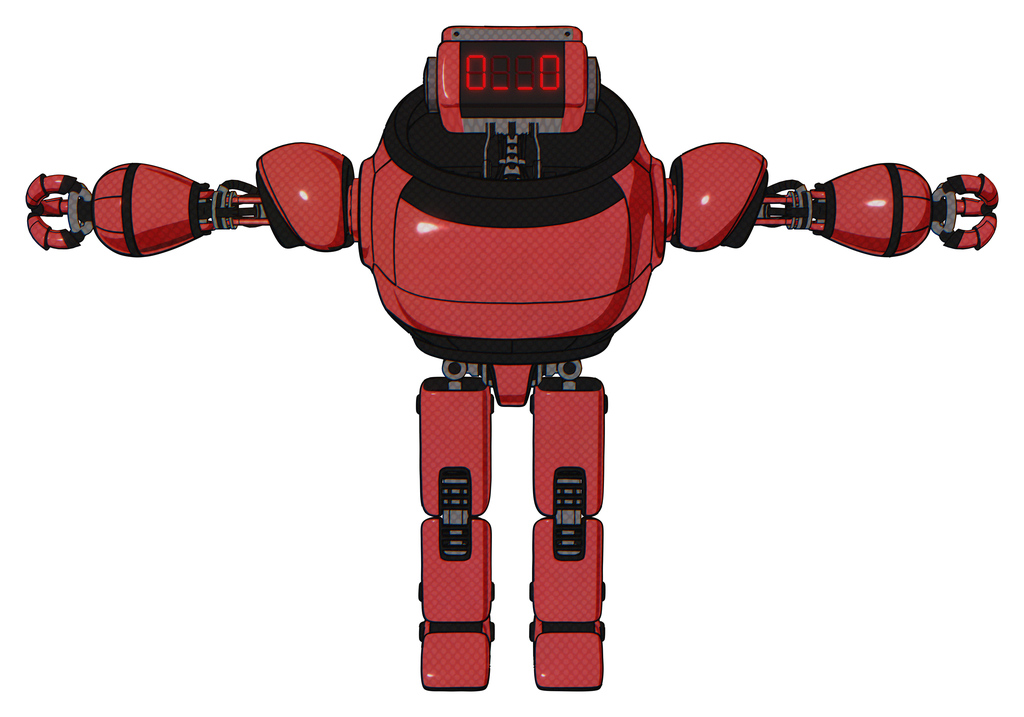 Automaton containing dual retro camera head and clock radio head and heavy upper chest and prototype exoplate legs. Primary red halftone. T-pose.