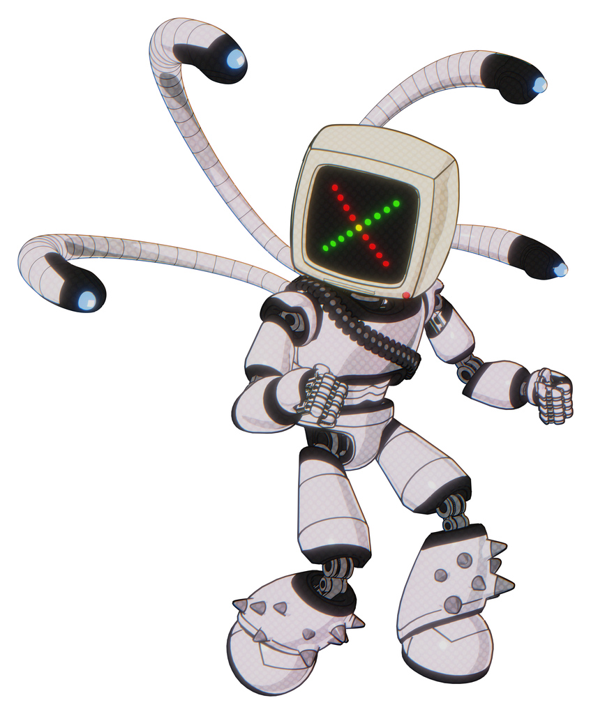 Automaton containing old computer monitor and colored x display and light chest exoshielding and rubber chain sash and blue-eye cam cable tentacles and light leg exoshielding and spike foot mod.