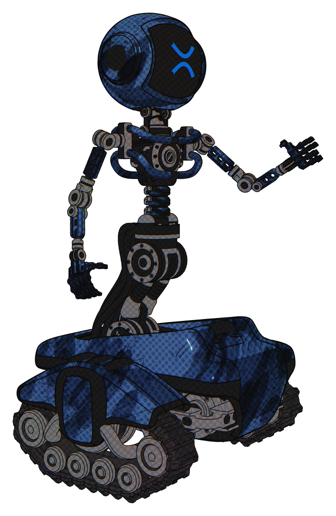 Bot containing digital display head and wince symbol expression and light chest exoshielding and no chest plating and tank tracks. Grunge dark blue. Interacting.