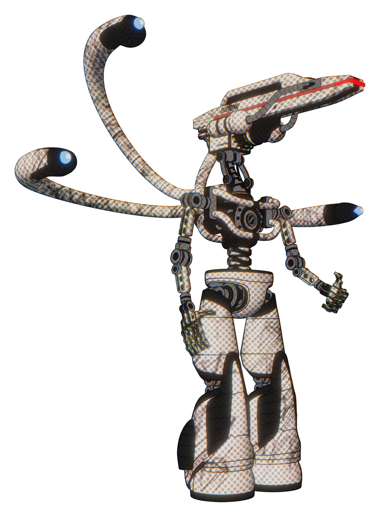 Robot containing elements: dual retro camera head, laser gun head, light chest exoshielding, blue-eye cam cable tentacles, no chest plating, light leg exoshielding, stomper foot mod.