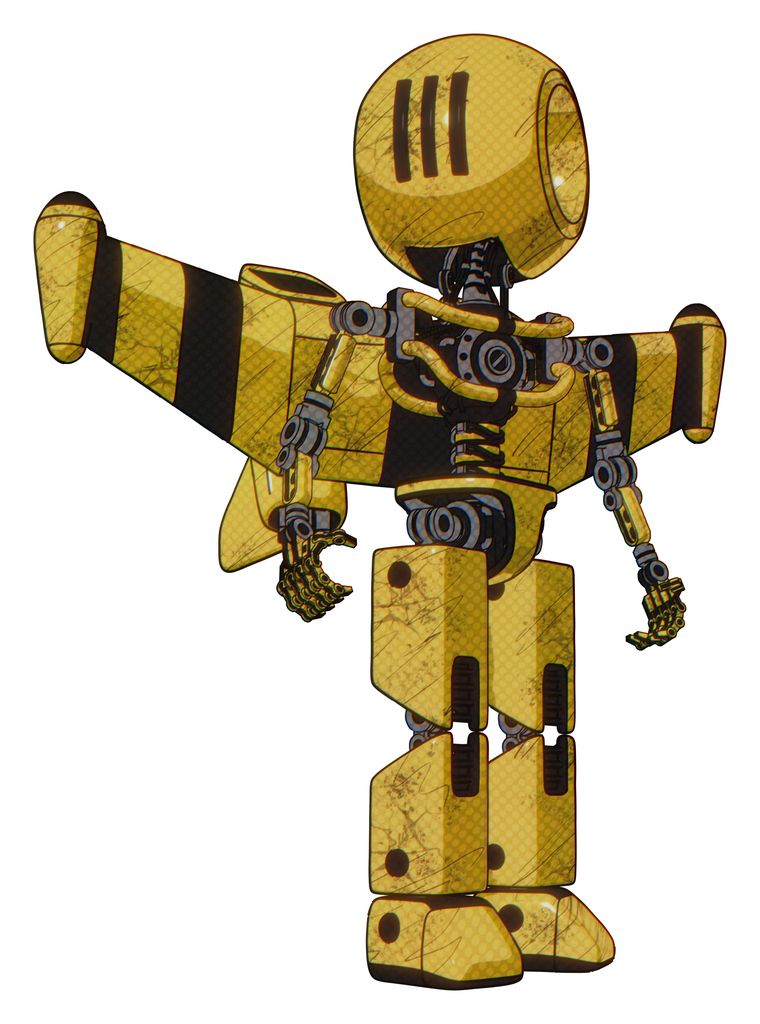 Robot containing round head and three lens sentinel visor and light chest exoshielding and stellar jet wing rocket pack and no chest plating and prototype exoplate legs. Construction yellow halftone.