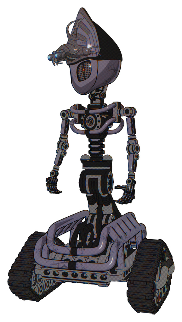 Mech containing elements: grey alien style head, metal grate eyes, alien bug creature hat, light chest exoshielding, no chest plating, tank tracks. Material: Light lavender metal.