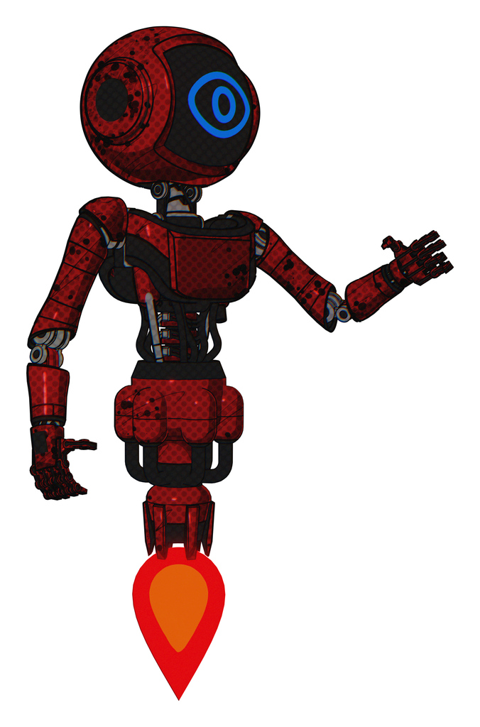 Mech containing digital display head and large eye and light chest exoshielding and ultralight chest exosuit and jet propulsion. Grunge dots dark red. Interacting.