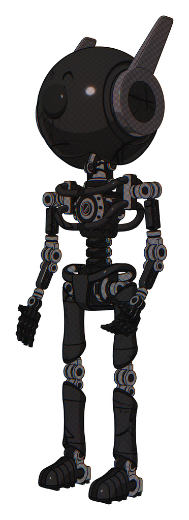 Robot containing round head and large cyclops eye and head winglets and light chest exoshielding and no chest plating and ultralight foot exosuit. Toon black scribbles sketch. Facing right view.