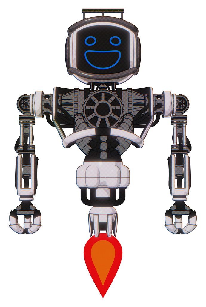 Cyborg containing digital display head and wide smile and led and protection bars and heavy upper chest and no chest plating and jet propulsion. White halftone toon. Front view.