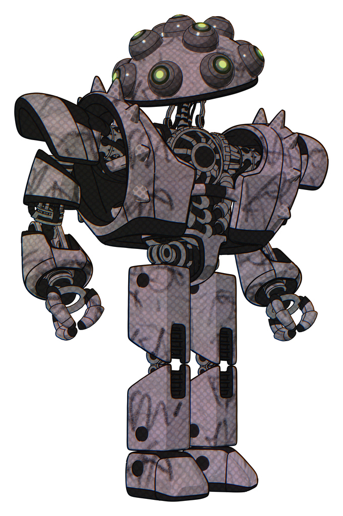 Droid containing many robo-eye domehead design and heavy upper chest and heavy mech chest and shoulder spikes and prototype exoplate legs. Dark sketch random doodle. Hero pose.