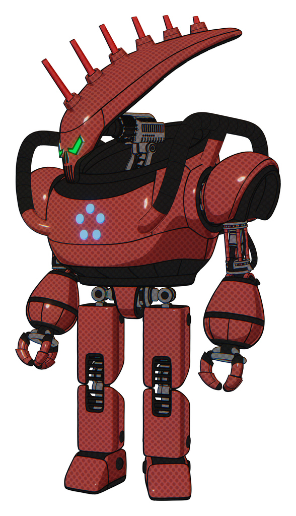Mech containing flat elongated skull head and heavy upper chest and circle of blue leds and prototype exoplate legs. Light brick red. Standing looking right restful pose.