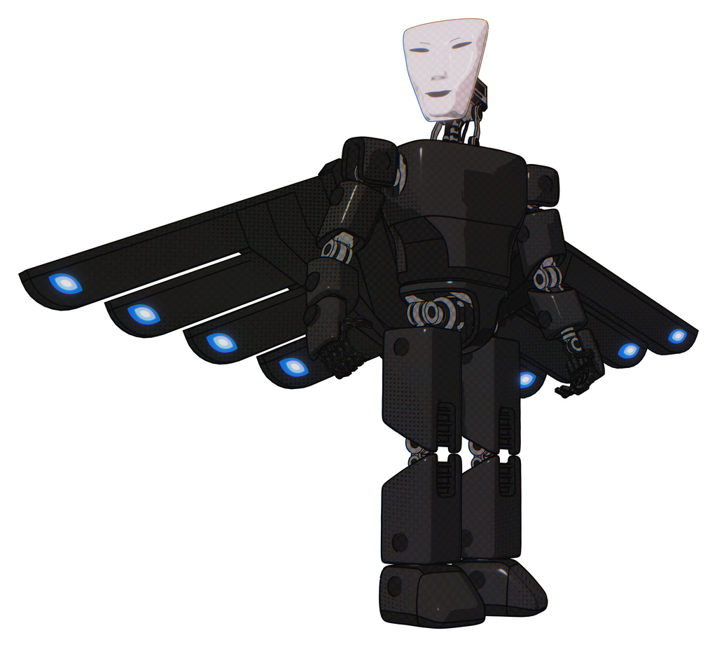 Robot containing humanoid face mask and light chest exoshielding and prototype exoplate chest and cherub wings design and prototype exoplate legs. Clean black. Hero pose.