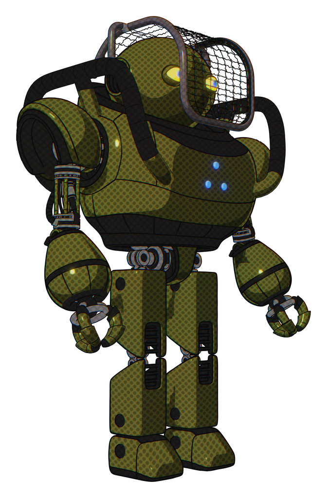 Bot containing oval wide head and yellow eyes and barbed wire visor helmet and heavy upper chest and triangle of blue leds and prototype exoplate legs. Army green halftone. Facing left view.