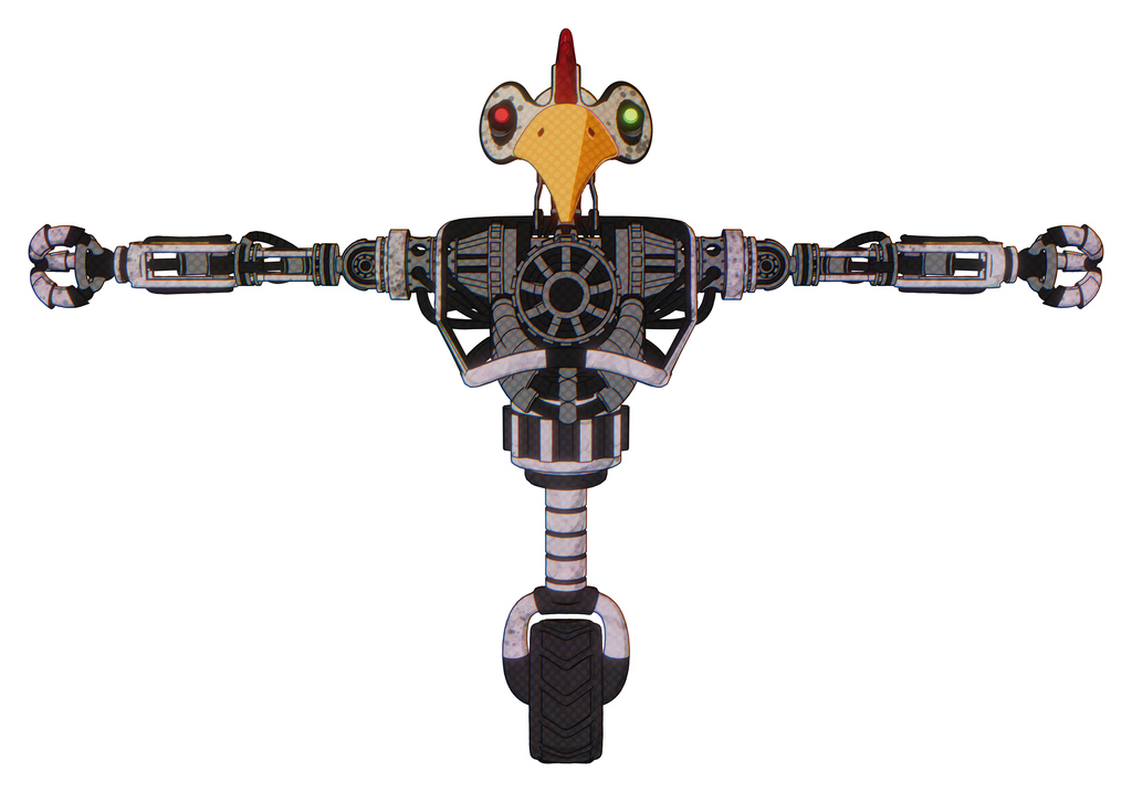 Cyborg containing bird skull head and yellow and green scope eyes and chicken design and heavy upper chest and no chest plating and unicycle wheel. Sketch pad dirty smudge. T-pose.