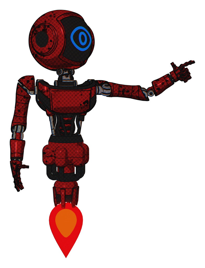 Mech containing digital display head and large eye and light chest exoshielding and ultralight chest exosuit and jet propulsion. Grunge dots dark red. Pointing left or pushing a button..