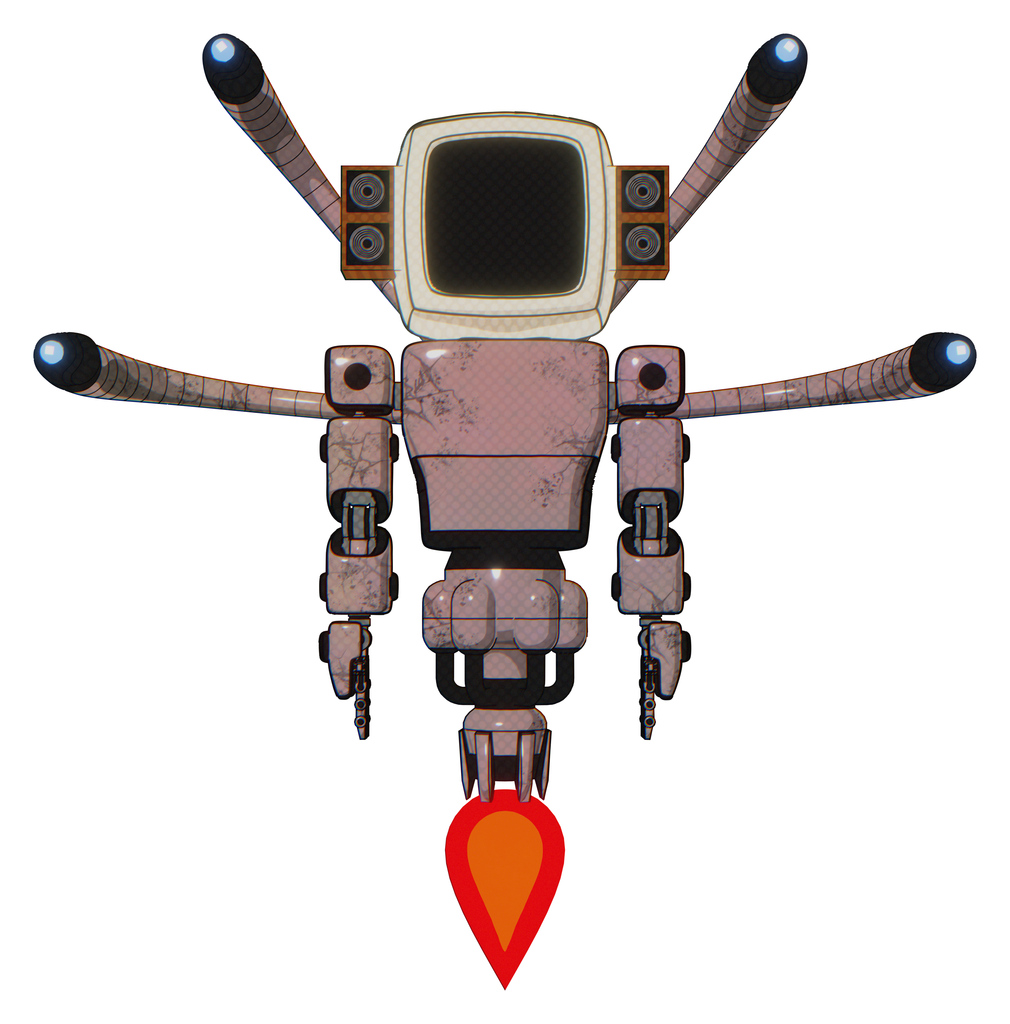 Bot containing old computer monitor and old retro speakers and light chest exoshielding and prototype exoplate chest and blue-eye cam cable tentacles and jet propulsion. Powder pink metal. Front view.