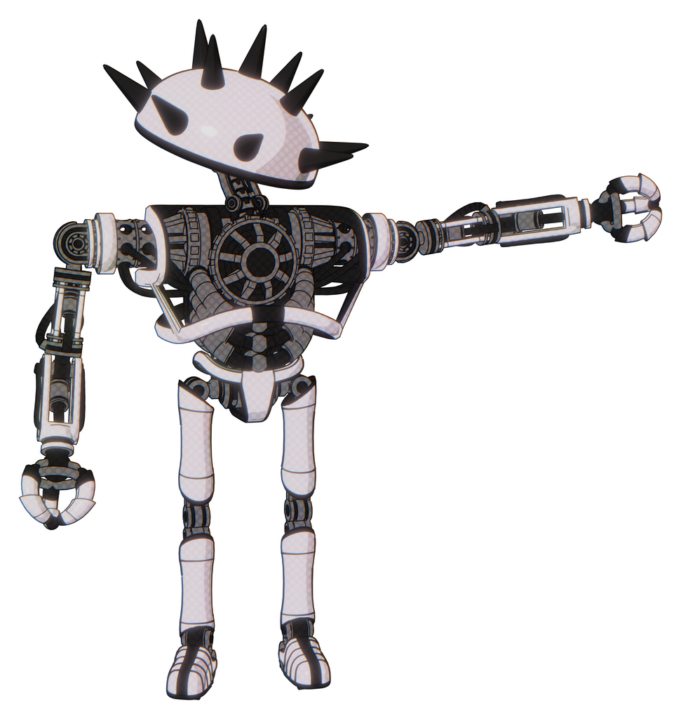 Automaton containing thorny domehead design and heavy upper chest and no chest plating and ultralight foot exosuit. White halftone toon. Pointing left or pushing a button..