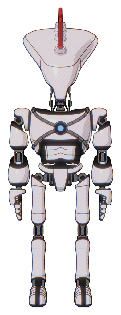 Droid containing flat elongated skull head and light chest exoshielding and blue energy core and ultralight foot exosuit. White halftone toon. Front view.
