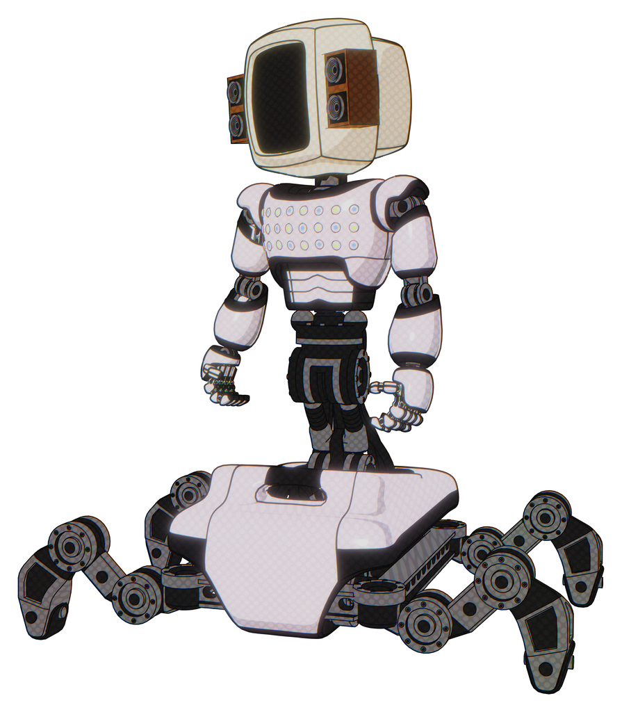 Mech containing old computer monitor and old retro speakers and light chest exoshielding and chest green blue lights array and insect walker legs. White halftone toon.
