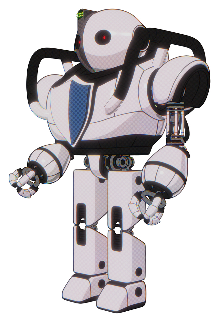 Mech containing oval wide head and small red led eyes and green led ornament and heavy upper chest and blue shield defense design and prototype exoplate legs. White halftone toon. Facing right view.