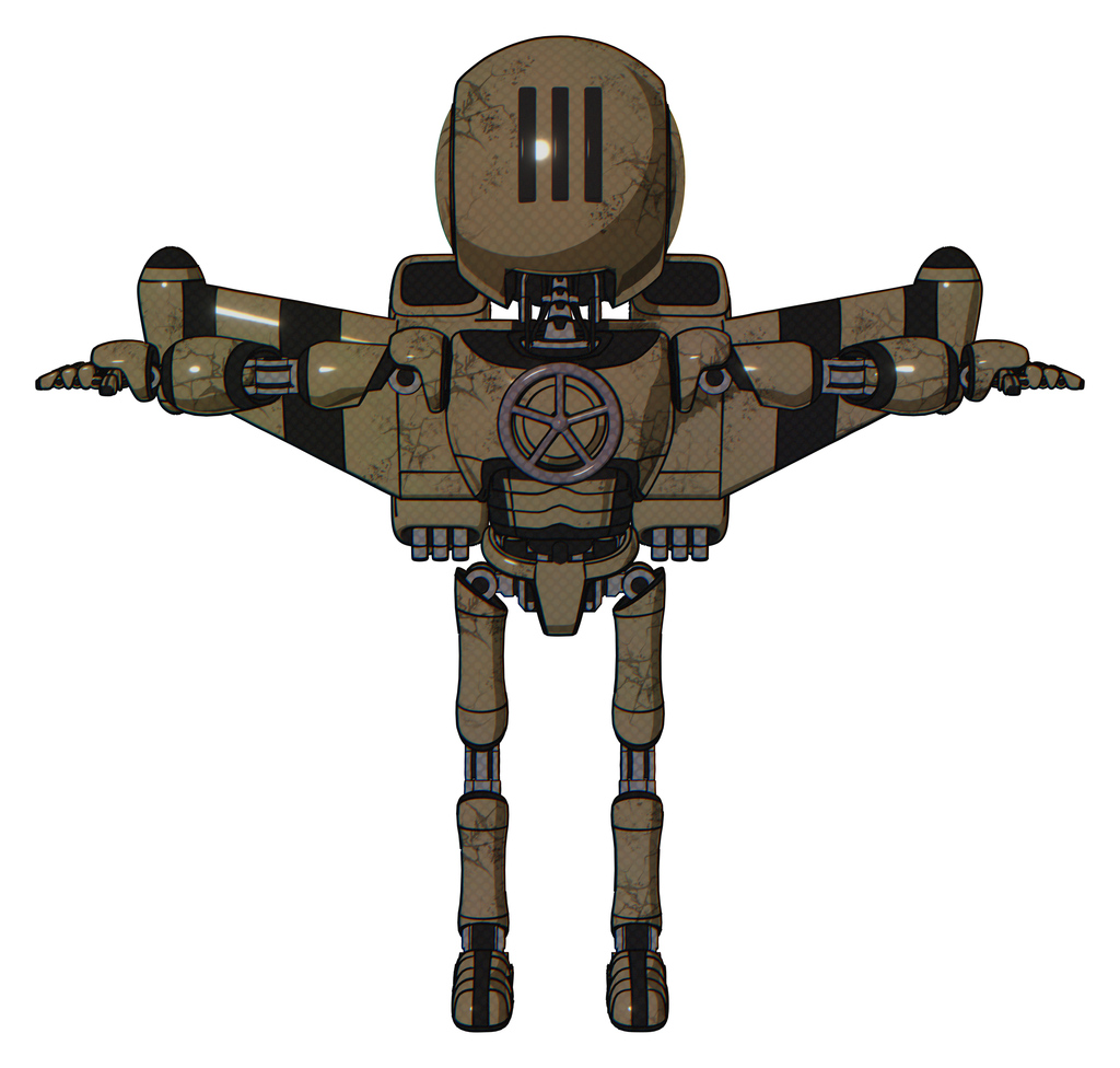 Bot containing round head and three lens sentinel visor and light chest exoshielding and chest valve crank and stellar jet wing rocket pack and ultralight foot exosuit. Desert tan painted. T-pose.