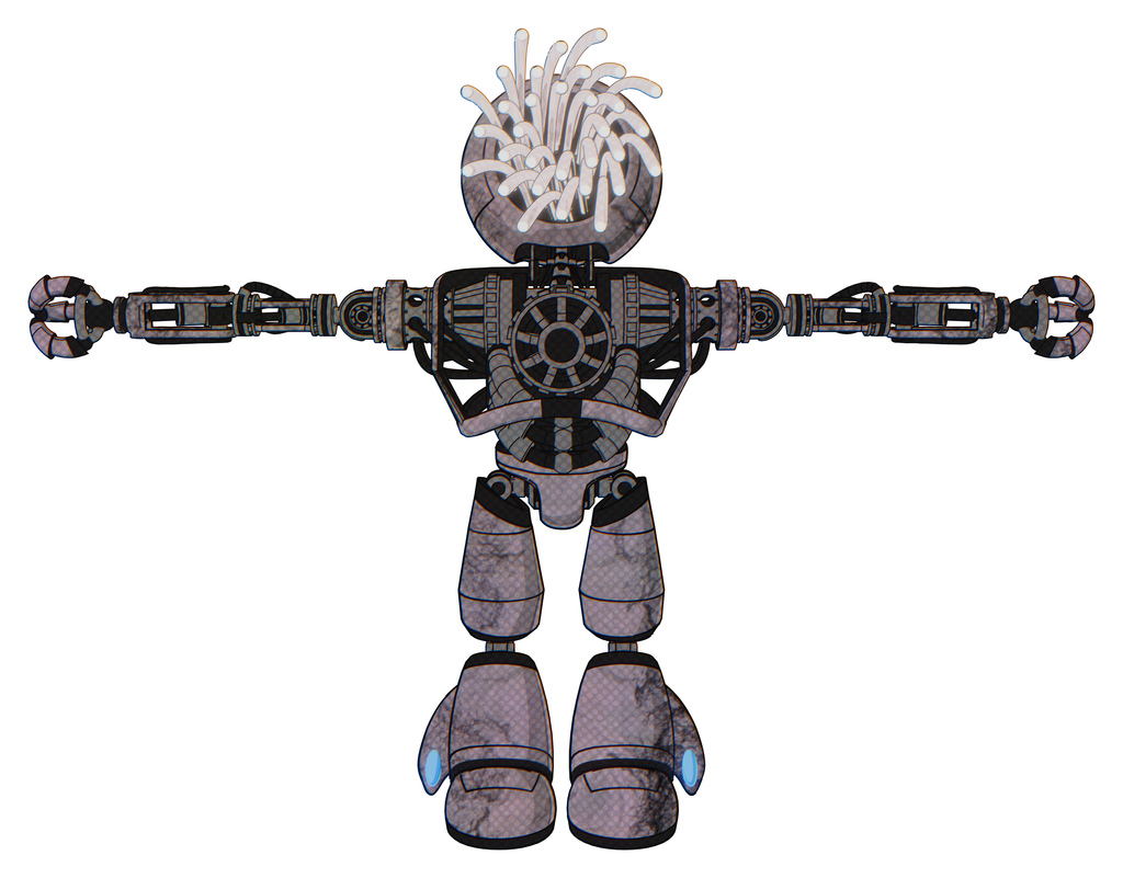 Robot containing round fiber optic connectors head and heavy upper chest and no chest plating and light leg exoshielding. Dark dirty scrawl sketch. T-pose.