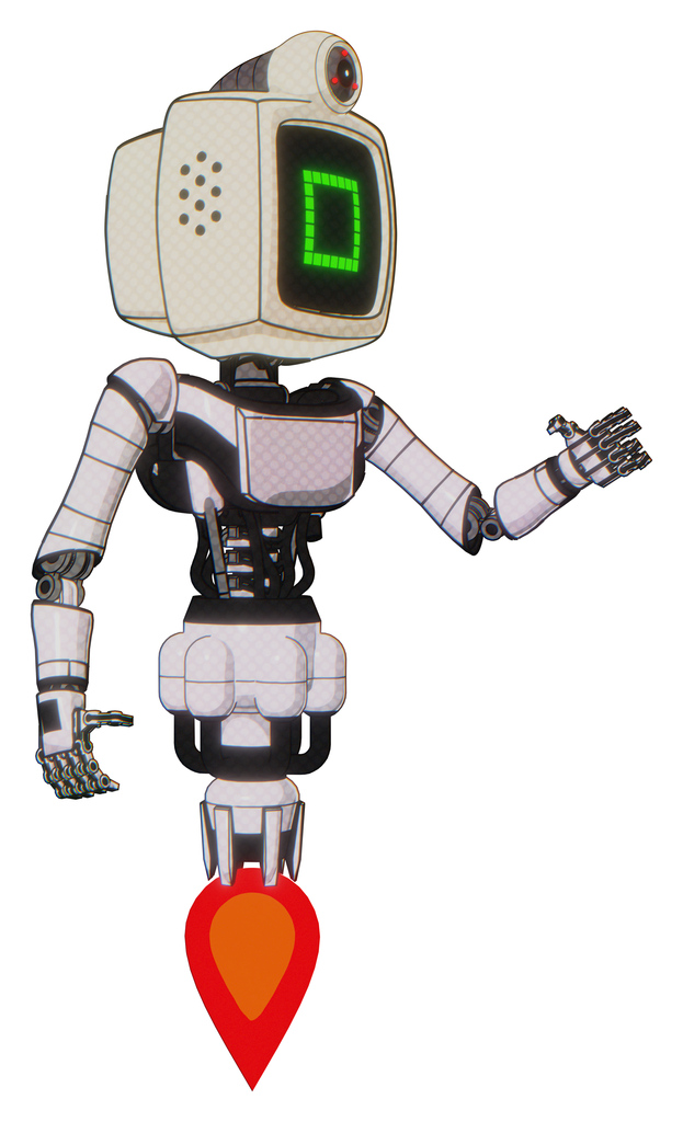 Bot containing old computer monitor and pixel square design and retro-futuristic webcam and light chest exoshielding and ultralight chest exosuit and jet propulsion. White halftone toon. Interacting.