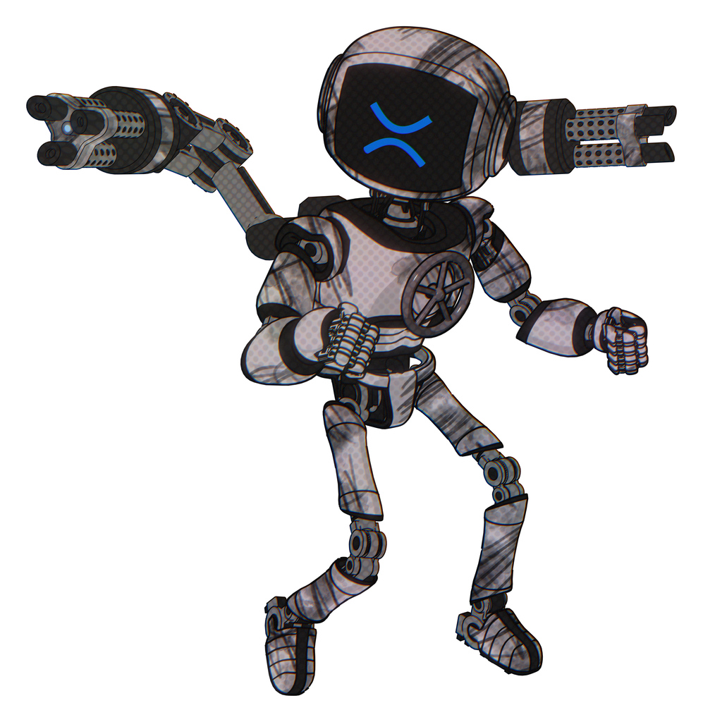 Robot containing digital display head and wince symbol expression and light chest exoshielding and chest valve crank and minigun back assembly and ultralight foot exosuit. Scribble sketch.