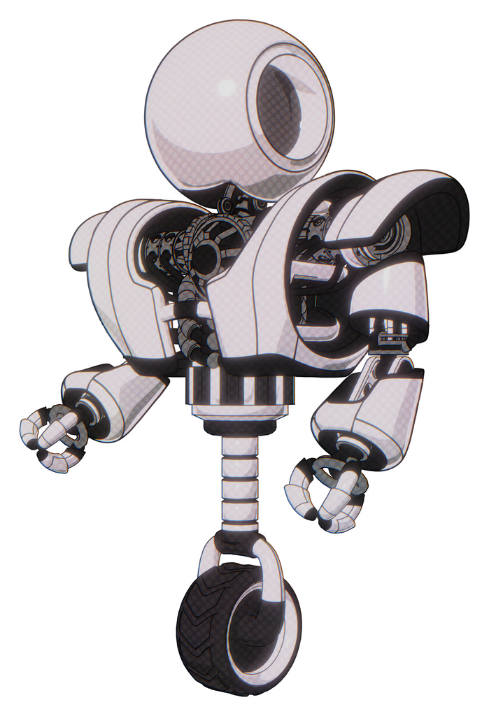 Droid containing round head and heavy upper chest and heavy mech chest and unicycle wheel. White halftone toon. Facing right view.