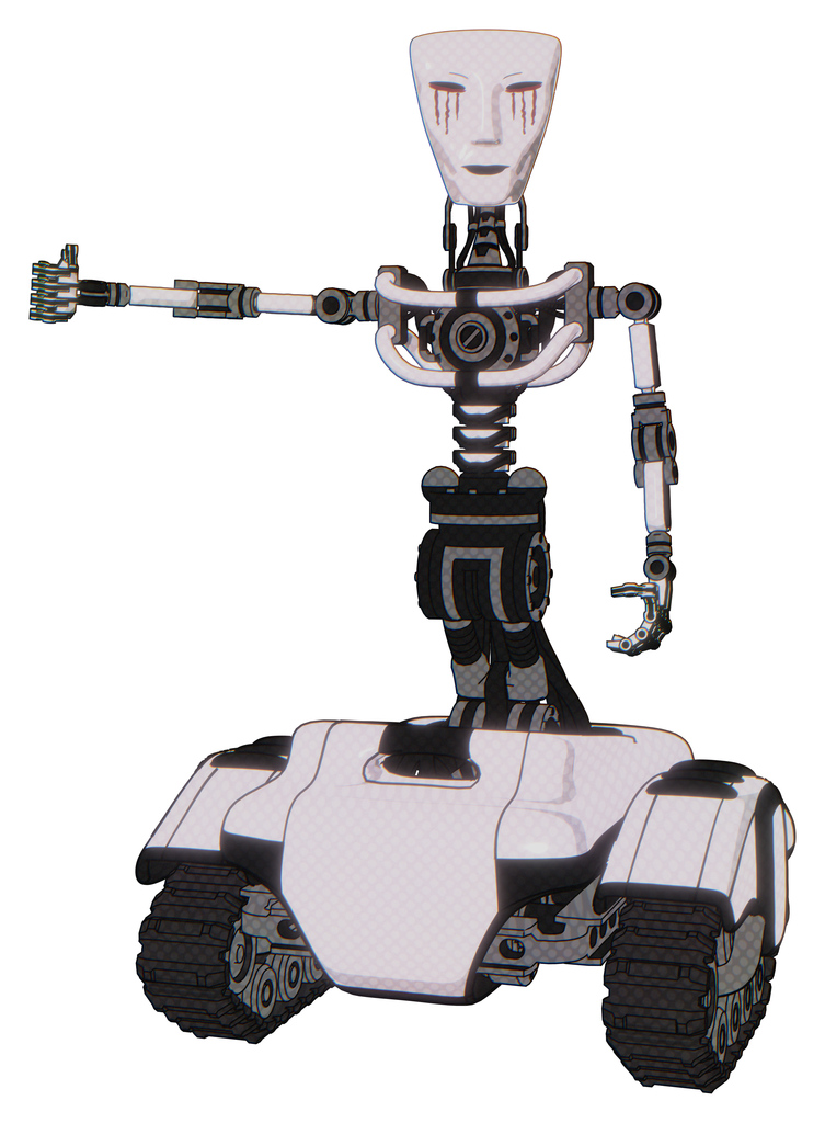 Mech containing humanoid face mask and blood tears and light chest exoshielding and no chest plating and tank tracks. White halftone toon. Arm out holding invisible object..