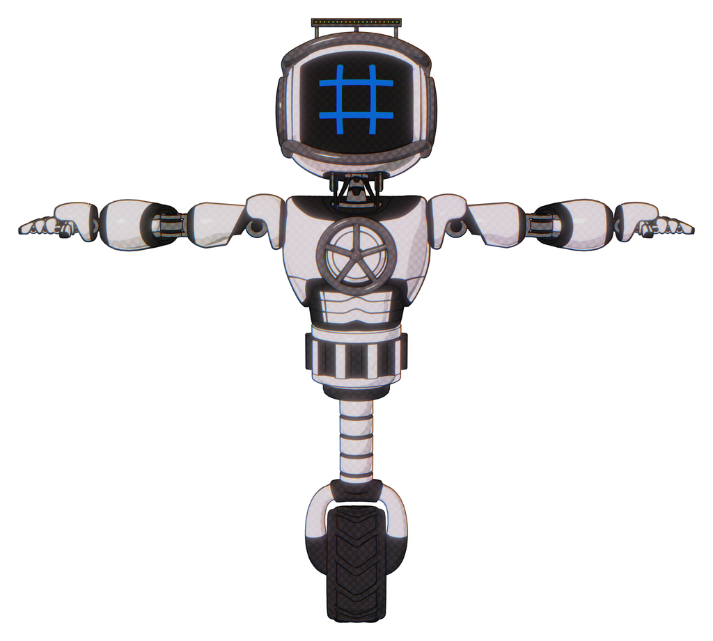 Bot containing digital display head and hashtag face and led and protection bars and light chest exoshielding and chest valve crank and unicycle wheel. White halftone toon. T-pose.