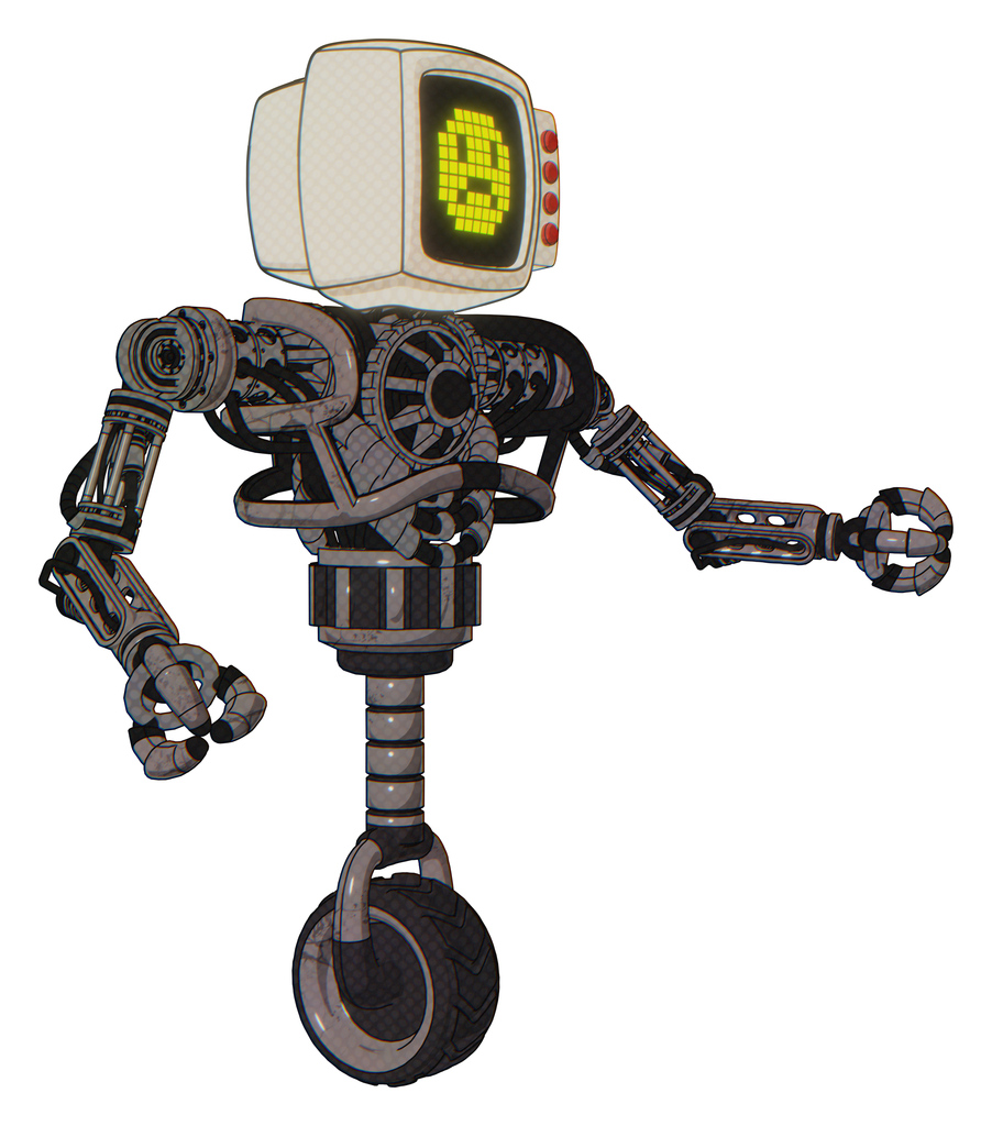 Droid containing old computer monitor and yellow sad pixel face and red buttons and heavy upper chest and no chest plating and unicycle wheel. Light pink beige. Interacting.