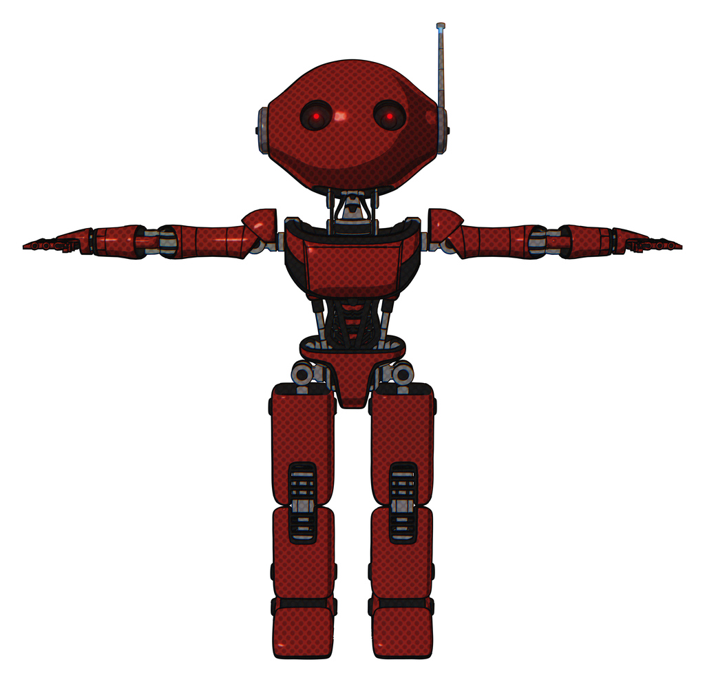 Robot containing oval wide head and small red led eyes and retro antenna with light and light chest exoshielding and ultralight chest exosuit and prototype exoplate legs. Matted red. T-pose.