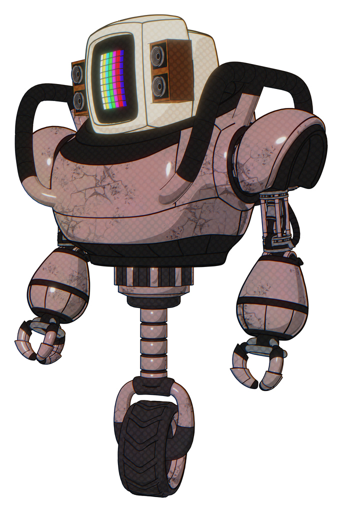 Automaton containing old computer monitor and please stand by pixel design and old retro speakers and heavy upper chest and unicycle wheel. Powder pink metal. Standing looking right restful pose.