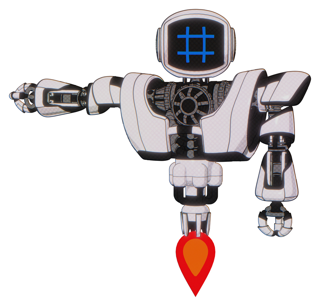 Automaton containing digital display head and hashtag face and heavy upper chest and heavy mech chest and jet propulsion. White halftone toon. Arm out holding invisible object..