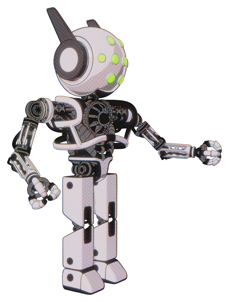 Bot containing round head and green eyes array and head winglets and heavy upper chest and no chest plating and prototype exoplate legs. White halftone toon. Interacting.