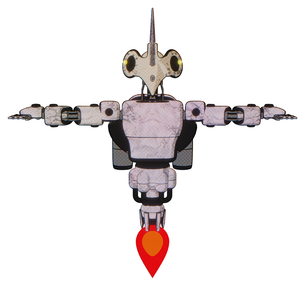 Droid containing bird skull head and yellow led protruding eyes and light chest exoshielding and prototype exoplate chest and rocket pack and jet propulsion. Sketch pad. T-pose.