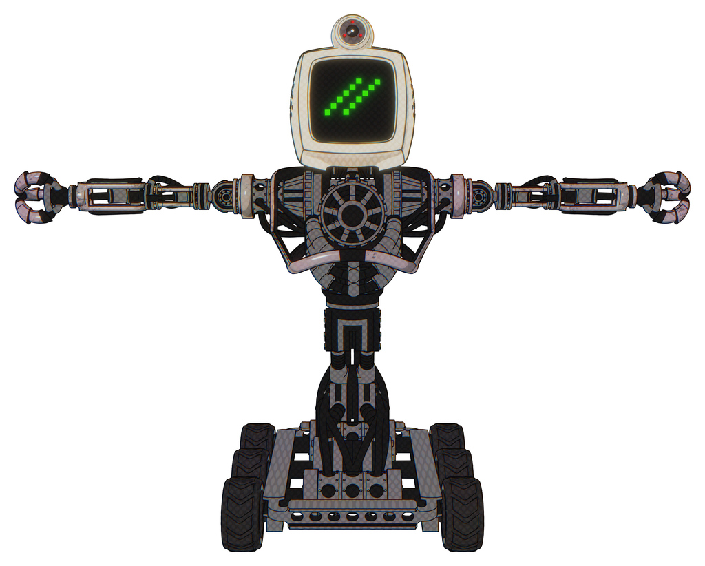 Cyborg containing old computer monitor and double backslash pixel design and retro-futuristic webcam and heavy upper chest and no chest plating and six-wheeler base. Gray metal. T-pose.