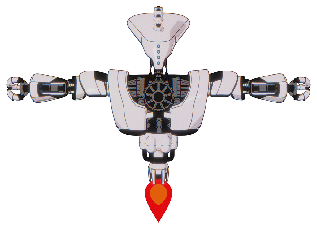 Mech containing flat elongated skull head and heavy upper chest and heavy mech chest and jet propulsion. White halftone toon. T-pose.